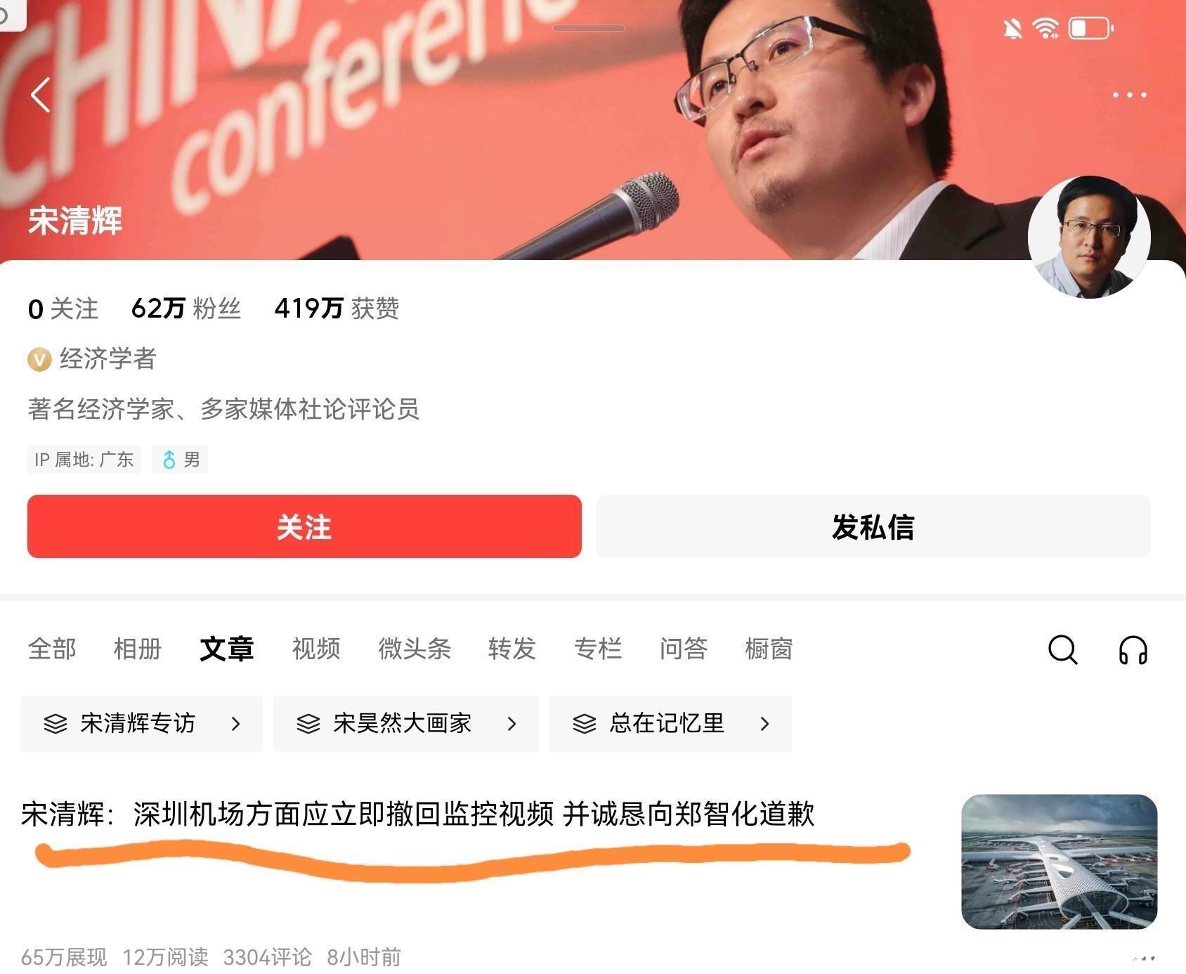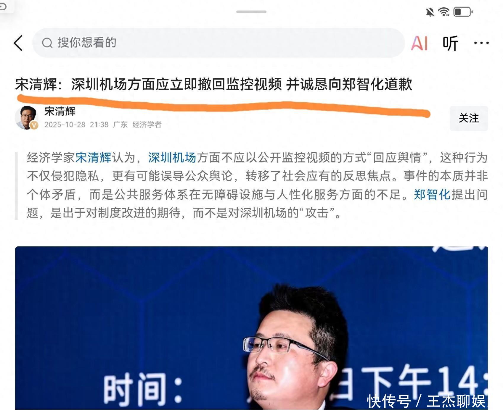 最近深圳机场和歌手郑智化的纠纷在网上吵翻了天。事情是这样的:郑智化在机场遇到服务问题,机场先是道歉承诺改进,接着还把监控视频公开给大伙儿看,让大家自己判断对错。结果经济学家宋清辉跳出来硬说机场得赶紧删视频,还要正式道歉,不然不行。这事就这么简单?有网友说机场做得对,公开视频本身就是透明解决问题。可宋清辉非要人家删视频,搞得不少人觉得奇怪,这专家是不是又要唱反调?网上各种说法都有,有的支持机场做法,有的骂宋清辉多管闲事。说起宋清辉这个人,他经常在热点事件里发言,这次也是照常站出来发声。评论底下有人调侃,说这专家每次热点都不缺席,发言总跟别人对着干,专门找特别的角度显示自己有水平。不过这次他反对公开视频,理由是可能涉及隐私,但更多人觉得机场已经处理得挺规范。有意思的是,视频公开后确实有不少人看了。大家七嘴八舌讨论,有人觉得机场工作人员没错,也有人说郑智化作为残疾人士应该得到更好照顾。总之公说公有理,婆说婆有理,没人能一口咬定谁对谁错。法律方面专业人士也有不同观点。有的律师说公开视频没问题,属于正当处理纠纷;也有说法提到隐私保护,认为个人影像随意公开可能侵权。两边都拿法律条文当依据,但具体怎么适用还得看实际情况。
